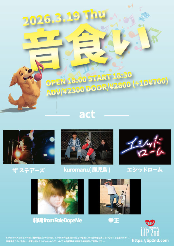 2026/3/19 Thu 「音食い」 スケジュール OPEN/18:00 START/18:30 ADV/¥2300 DOOR/¥2800(+1D¥700) ーactー ザ ステアーズ kuromaru.(鹿児島) エシッドローム 莉瑚 from Role Dope Me 幸正 2026年2月18日/作成者: @lip2nd http://lip2nd.com/wp-content/uploads/2021/03/logo_01.png 0 0 @lip2nd http://lip2nd.com/wp-content/uploads/2021/03/logo_01.png @lip2nd2026-02-18 20:00:312026-02-17 17:15:062026/3/19 Thu 「音食い」